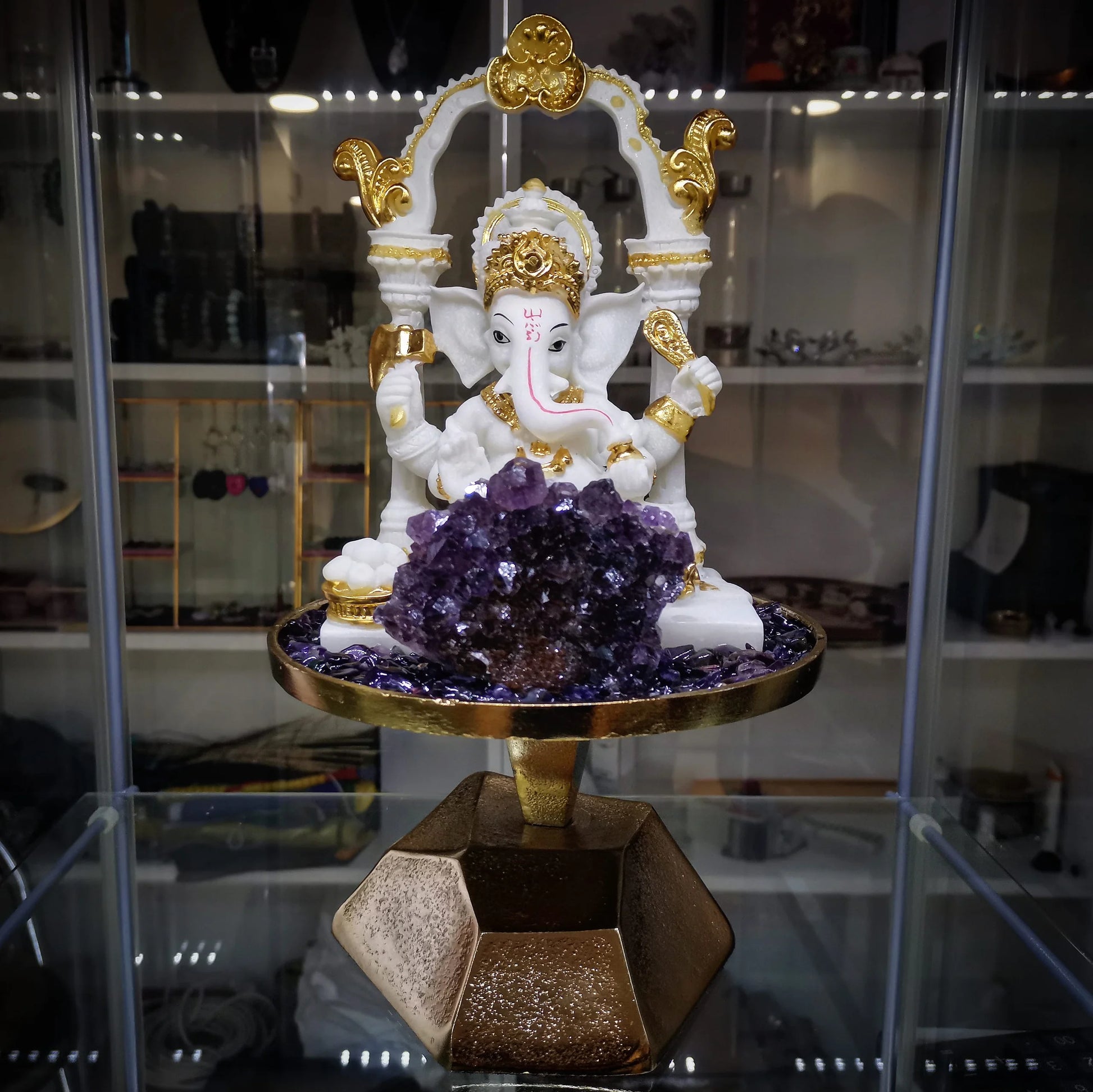 Radiating wisdom and divine presence, this altar piece honors Lord Ganesha, the remover of obstacles and bringer of prosperity. Crafted from white cold-cast stone, the deity is elevated upon a specially designed metal altar, adorned with the radiant union of amethyst and citrine growths.
