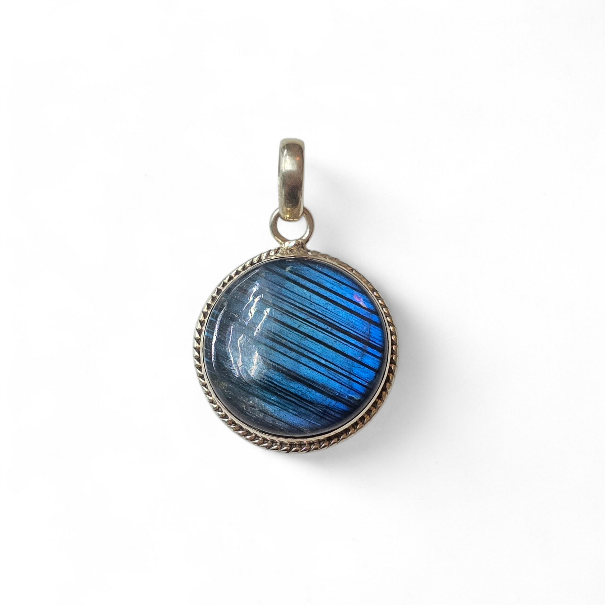Set in genuine 925 sterling silver, this circular Labradorite pendant reveals a captivating natural sheen with flashes of colour that symbolise transformation and intuition. Spiritually known as a stone of protection and inner vision, Labradorite supports intuitive awareness, energetic shielding, and personal growth. The circular form represents wholeness and flow, making this pendant ideal for daily wear, offering balance, insight, and refined mystical elegance.