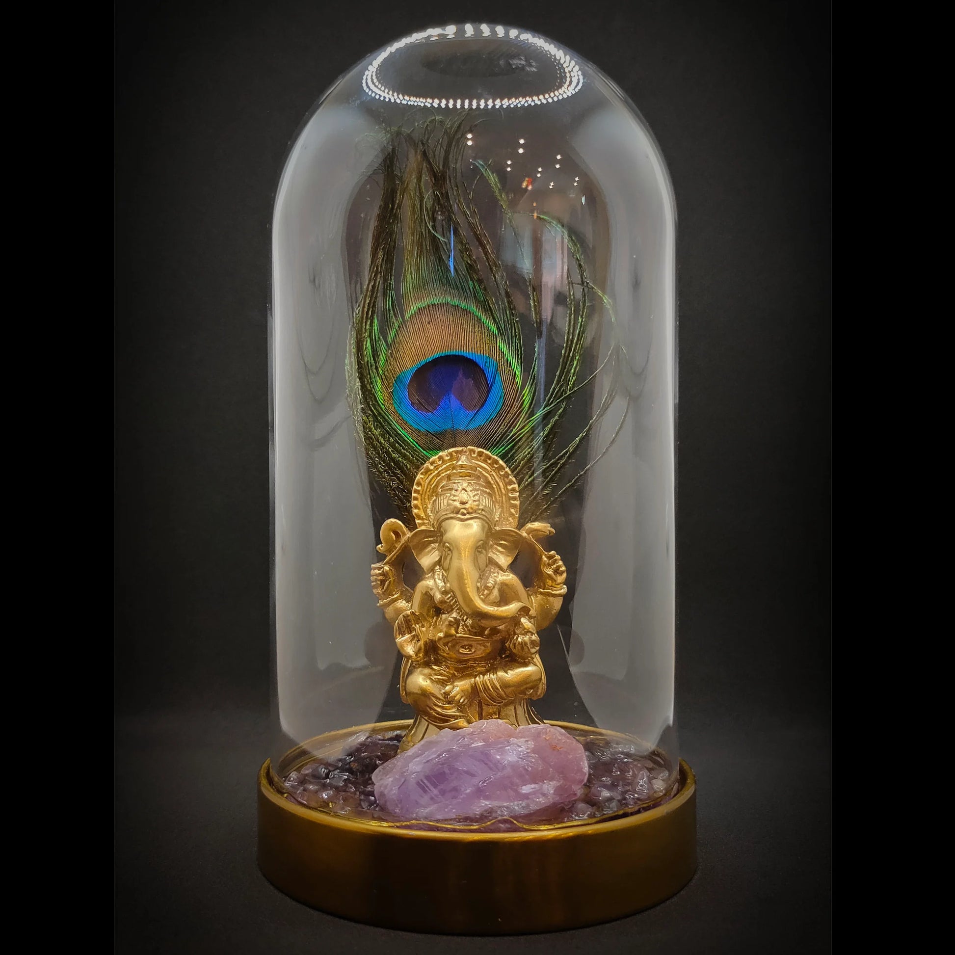 Uniquely crafted by the Starlight Tarot team, this one-of-a-kind piece is encased in a protective glass dome, adorned with a real peacock feather and natural crystals. The peacock feather symbolizes divine vision and immortality, amplifying the energy of Ganesha’s form while inviting beauty, abundance, and spiritual awakening into your sacred space.