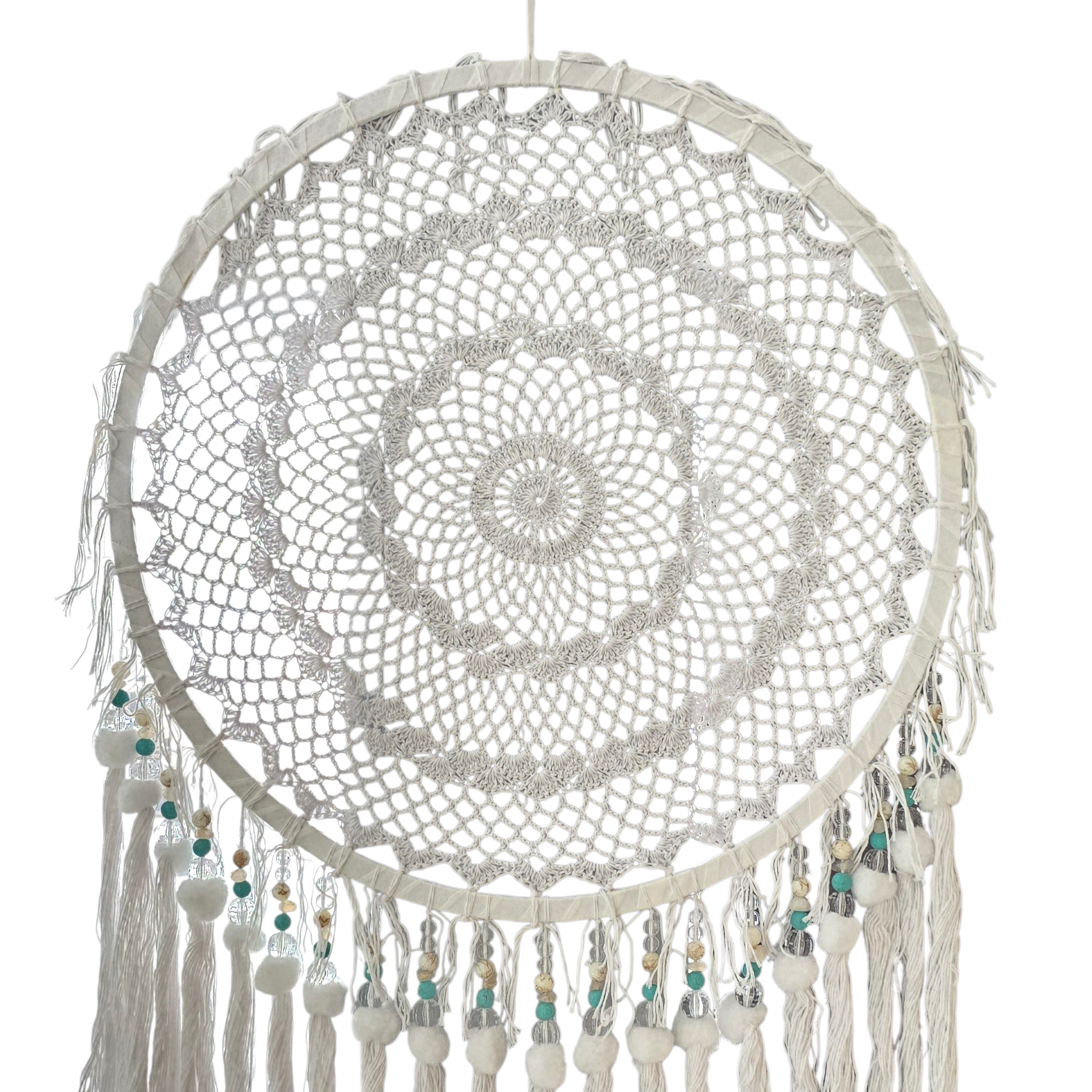 White Macramé Bohemian Dreamcatcher with Beads and Crystals (XL)